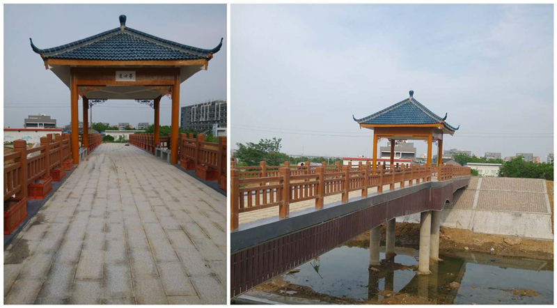 连心桥座落于历史悠久、特色鲜明、学风优良的中国药科大学,其跨越解溪河,河道无通航要求。桥梁为三跨预应力混凝土连续箱桥梁,边跨跨径22m,中跨跨径4m,桥梁总长48m,宽5—6.5m,桥梁与河道正交。桥梁外立面采用塑木装饰,跨中桥面设置钢筋砼仿古四角亭。