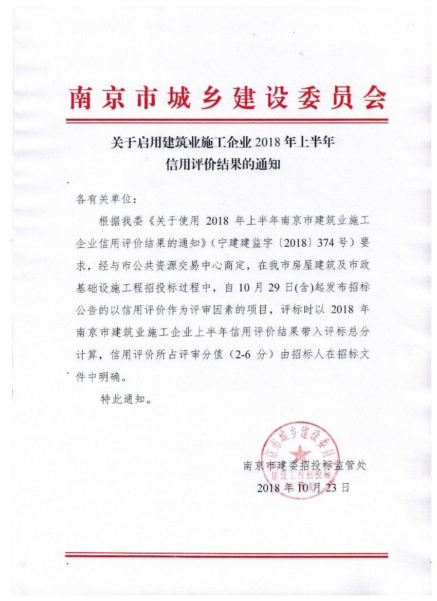 关于启用建筑业施工企业2018年上半年信用评价结果的通知